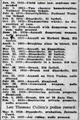 While researching a case for my upcoming book on historic D.C. murders, I came across the criminal records of two suspects, William Kappel and Leo Cullen. They present a rather intriguing glimpse of Depression-Era crime (and evidence that it wasn’t hard to avoid jail time). It’s interesting that Kappel was charged with violating child labor laws when he was the child being employed, although in fairness to the system his sentence was suspended. Some chargers sound amusingly archaic, like “incorrigibility” and “breaking glass in street.” Note that Kappel’s and Cullen’s records overlap on August 26, 1933 when the two buddies were charged with assaulting poor Nick Vlahos.